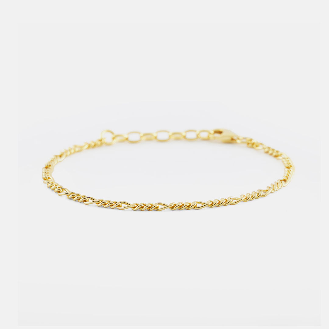 The Figaro Bracelet is a slim chain, approx 3.5mm thick, consisting of 3 small links followed by 1 elongated link. The bracelet is finished in a premium 0.3 micron 14KT Gold Plating.