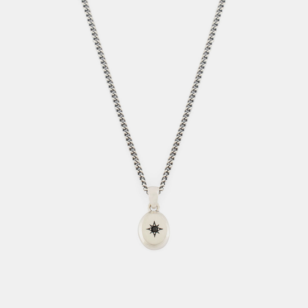 The Silver Polaris Necklace is a minimal necklace with a small oval pendant and black Cubic Zirconia stone. The necklace is made from 925 Sterling Silver, and is hallmarked verifying its quality.